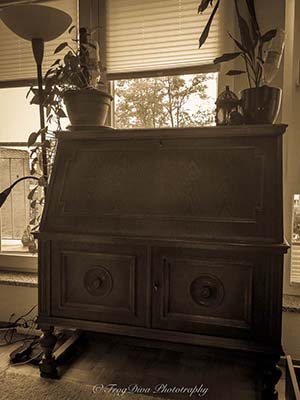 Then a sudden change of fate turned things around for me. Someone else’s decision to uproot and start over in another country placed me in the fortunate spot of giving some pieces of furniture a new home, a new beginning. I wrote the other day about the chest of drawers that anchored my room, and when those items were delivered to me, the desk had been too heavy to bring down the stairs by just two exhausted people. So with the able services of something called Möbeltaxi (furniture taxi) – there is something similar in Manila as well – the escritoire made its way into it’s new home. It was a perfect fit into the conservatory!