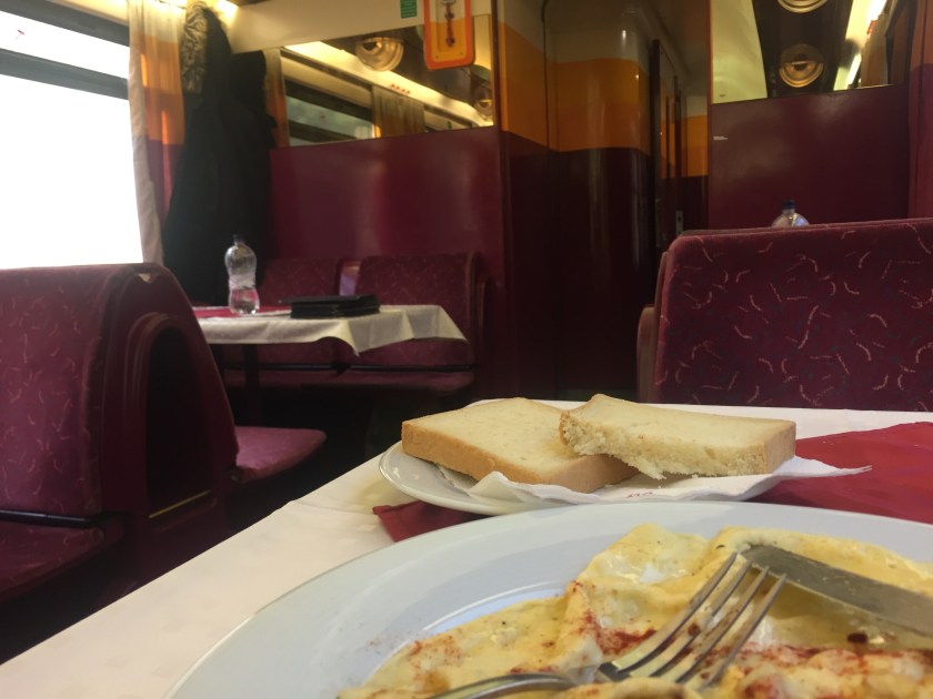 Except for the conductor, the rest of the crew is Hungarian, looking bored and rather unwilling to be alive and perky. Unlike the First Class service on an ICE train, there is no bistro service at your seats, so my daughter and I took turns in eating our breakfast, so Champagne wouldn’t be left alone. I wish you could see the cook though, every bit the roadkill grump that you expect on such a trip! And the food… well, to quote my daughter: the eggs weren’t rotten. The bread, however, is leathery with a touch of sawdust, and the Capuccino is sadder than my own depression. I’m no snob, and I rather enjoy the rustic touch to any trip, so I will be kind and say that the view outside is breathtaking. I hate winter, but the landscape we are passing is truly the stuff philosophers feed on.