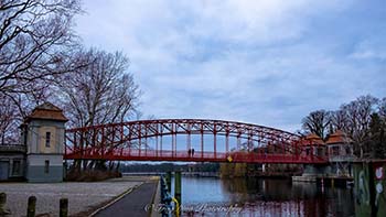 This is by far my favourite bridge in Berlin so far. The Prussian portals on both ends can also be seen on the Charlottenbrücke in Spandau, but the charm of the red steel bridge with the wooden panels will beat the pants off any other bridge in this city. It has always been a pedestrian bridge and will always remain one, with the exception of all the water fowl and other birds that find their way to it.