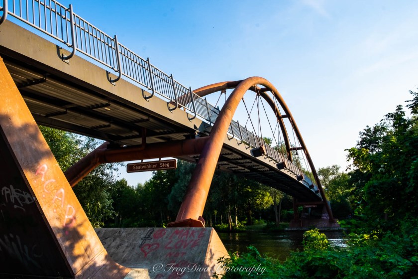 The Saatwinkler Steg, like a few other bridges in Berlin, is not of great historical significance, but it is interesting, has been planted (well, constructed) in an even more interesting location, and of all the bridges I have sought out thus far, the most difficult to find. According to the write-up, this bridge was along the Spandauer ship canal and Google Maps pointed to a particular spot. So off I went but there was no such bridge to be found where the map said it supposedly was. Looking up and down the canal gave me no further indication to such a bridge even existing in the area.