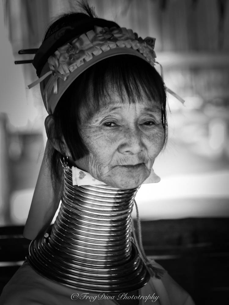 The brass neck coil is a difficult thing to look at, but even more difficult to understand. A Karen girl will get her neck coil at the age of five, and will start small. The coil is changed every three years and the length increases, as does the weight. I had the chance to hold a neck coil for and adult and was shocked at the weight. There was at least 10-15kg in my hands! What the coil does is that it pushes the shoulder blades down and keeps the neck extended all the time, giving the woman a long-necked appearance. They do not remove the coil at any time for any reason whatsoever, except when it will be exchanged for a new one. Legend has it that in the past this was the tribe’s way of protecting the women from tiger attacks.