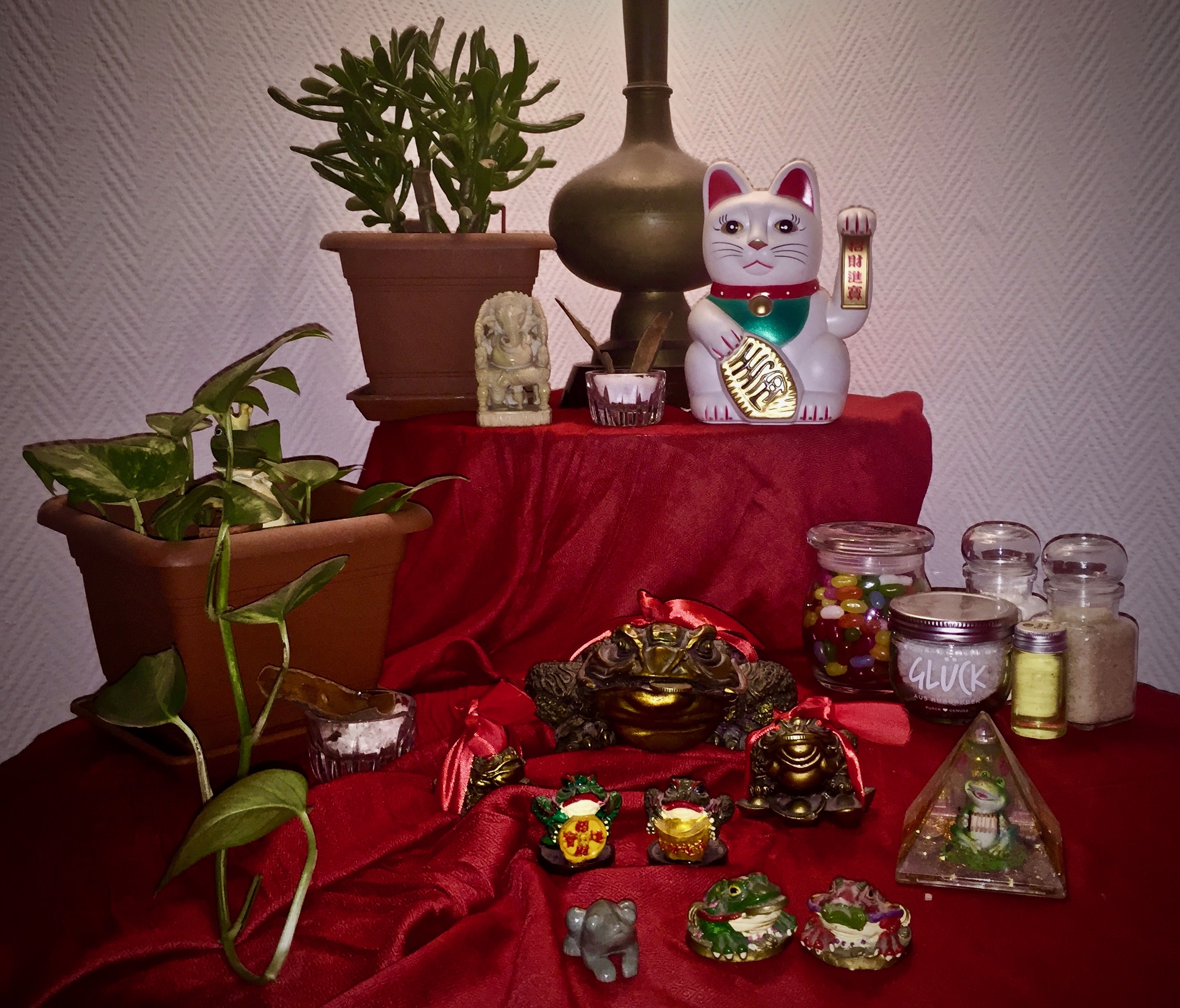 Naturally, in the main Feng Shui wealth corner (southeast), the traditional rules were enhanced: the waving cat, two types of money plants – jade and devil’s ivy (the irony of the name!), nine money frogs (most with a coin in the mouth and one jade frog), full containers representing abundance – flour, rice, oil, sugar, salt and sweets. These items are also the first one traditionally brings into a new home, and as far as I can remember, I don´t think I have ever been remiss about this particular ceremony. You will also note the prominence of red here – it is because the money frogs need to be “activated” in the wealth corner. Many people overlook this feature about the money frogs and simply position them there. In order for a money frog to do its job and attract the wealth, it has to sit on a red surface and/or be tied with a red ribbon.