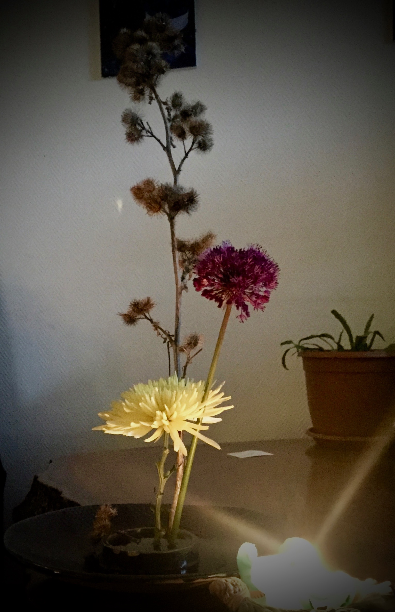 Life somehow got in the way and I neglected my ikebana for the last three decades. Until now. There are a lot of aspects of my life that are emerging or re-emerging as a result of a long and painful journey of self-discovery through psychotherapy. One of the angles I have been working on is getting in touch with all the suppressed dreams and buried goals that were cast aside for the sake of others. Duty is a jealous mistress who does not allow much interference, and so it came to pass that the silence and mindfulness demanded by ikebana was pushed further and further back.