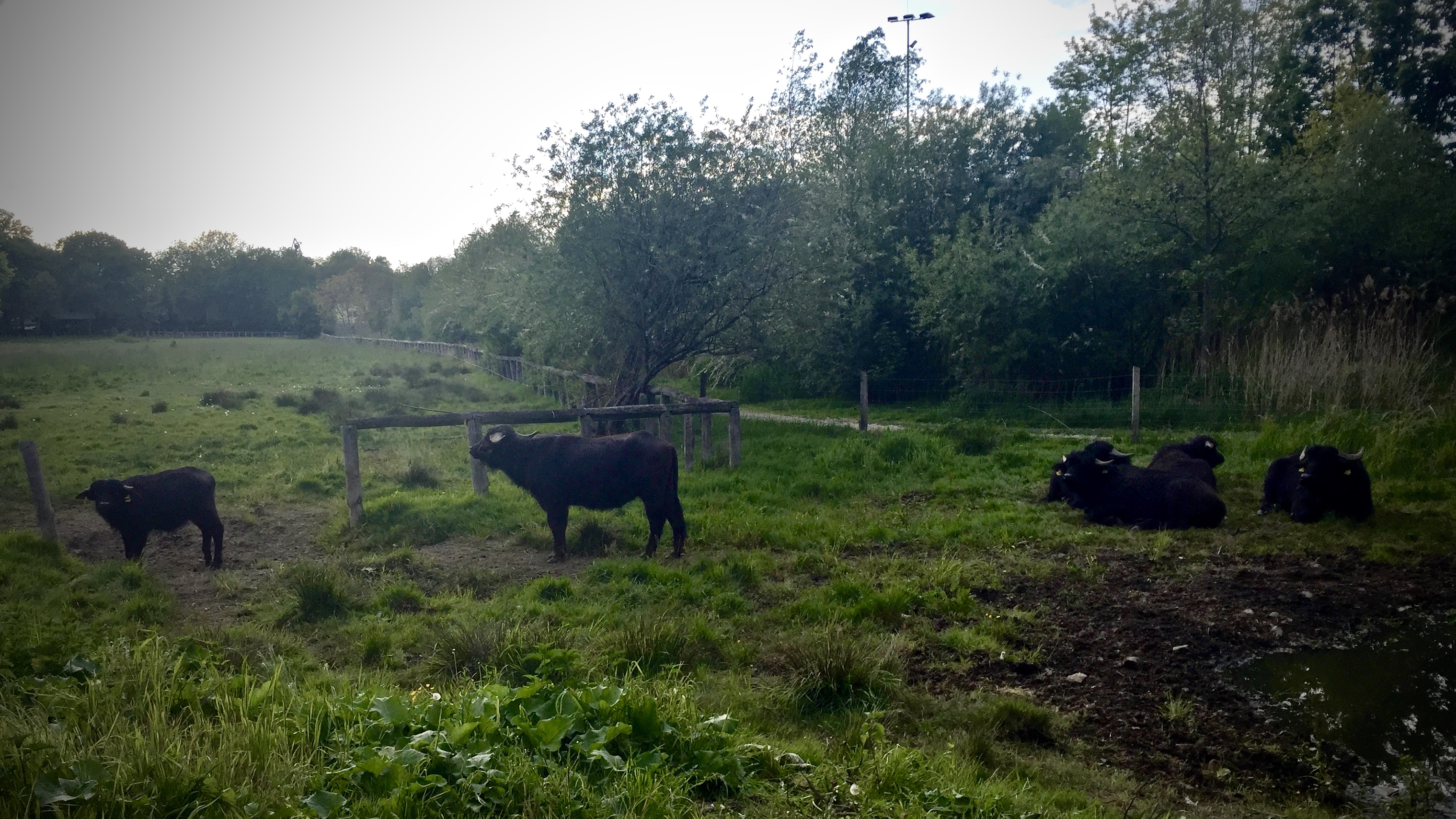 Because I stopped to look, I greeted the youngest member of the buffalos, with a proud and protective mother nearby. They have just been let out to pasture again after such a long winter. I still can’t get over the fact that I have this herd of Asian water buffalos down the road from my building. They have been here for years, and the Spandauers are proud of them.