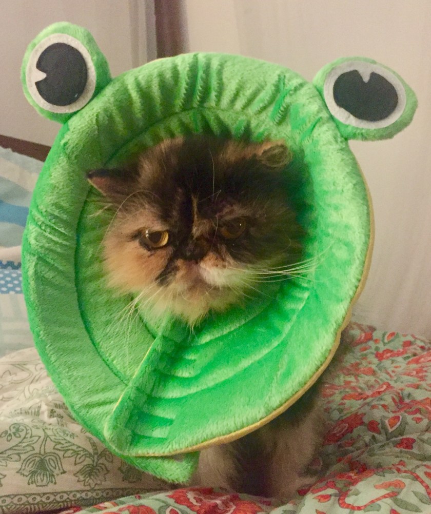 Remember what I told you the other day about my allergies? Well I got some medicine for it and am not supposed to scratch… but mom in all her kindness, decided that an ordinary pet cone would not do for me. A soft collar would be much more comfortable, she said… and much cuter. Hrmpf!