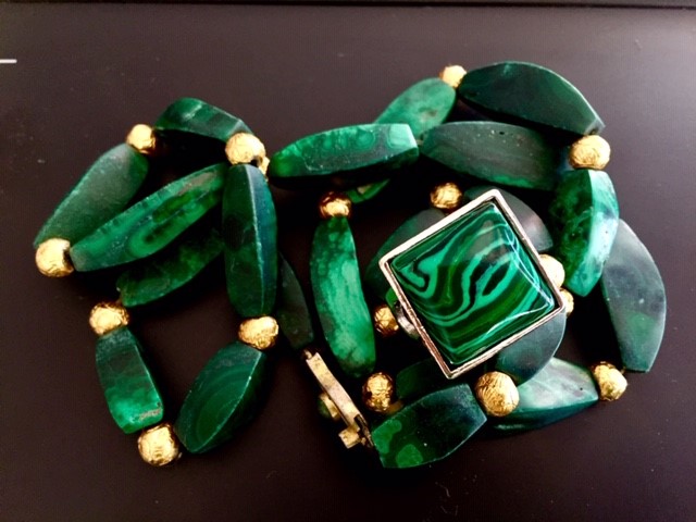 Kenya is also the place where Mommy taught me all about precious and semi-precious stones. Back in the 70s, big clunky jewellery was in fashion, and stones were cheap, dirt cheap and big. She picked up a few items here and there, but more often than not, Mommy ended up buying the stones in Kenya for friends then had them mounted in Hong Kong due to the exquisite craftsmanship there. Mommy herself was not that into fancy high-end jewellery, so whatever I inherited from her, I had re-set in India over the years. One such peculiar piece was this string of malachite stones. Truth be told, although I had them re-strung almost 20 years ago, I only learned to appreciate them quite recently.