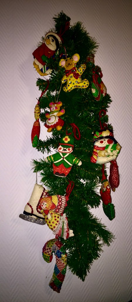 When I unpacked the tree, the assorted garlands tumbled out as well and then it struck me I could have a childhood garland on the side loaded with the quilted decorations and the tree could continue its elegant solo performance.