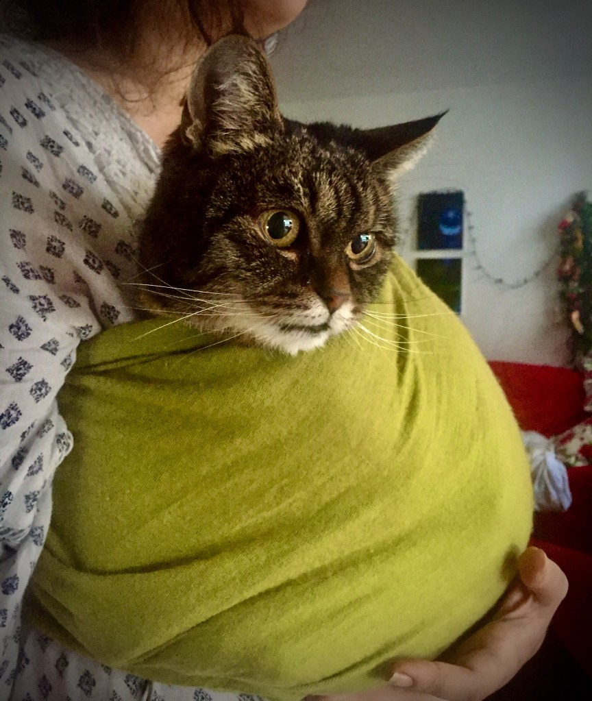 Enter the baby wrap! It is basically a long human shawl that was tied across the shoulders and provided me with a kangaroo pouch so I could be close to the human, feel the warmth, and they could go about their business. OK… I can live with this. Wait, let me rephrase that, I love it! No, I don’t think I am being spoiled, this is absolutely part and parcel of cat sitting services isn’t it? No? Well, it should be. I even get to sit in the pouch while Human T is writing at her desk, and we danced around to loud Billy Joel music. Piano Man is a great cuddle-the-anxious-cat song! Dancing and swaying in the pouch does make me seasick though, so I protested to the dancing.