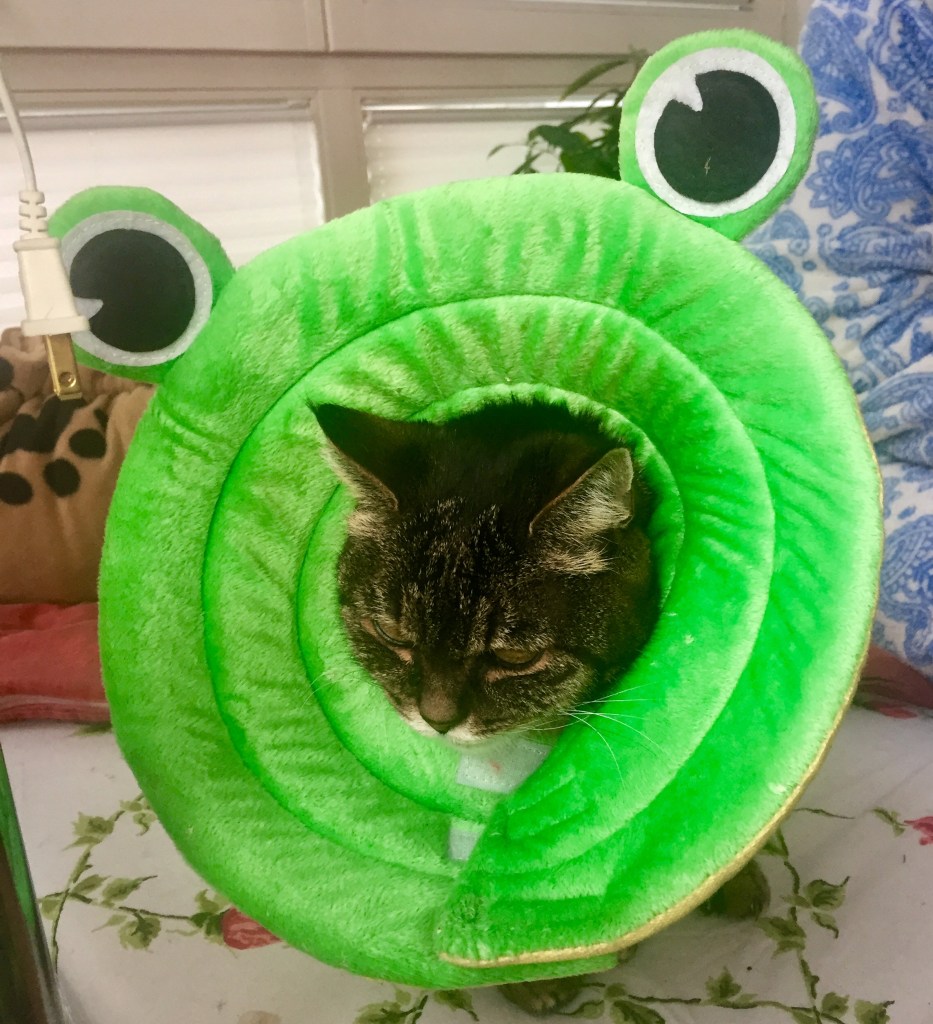Just to explain, this is a medical cone, a funnier (to humans) version of the plastic veterinarian ones. I got to wear it just for this shot because someone thought it would be amusing. My dignity just walked out the door with her suitcase!