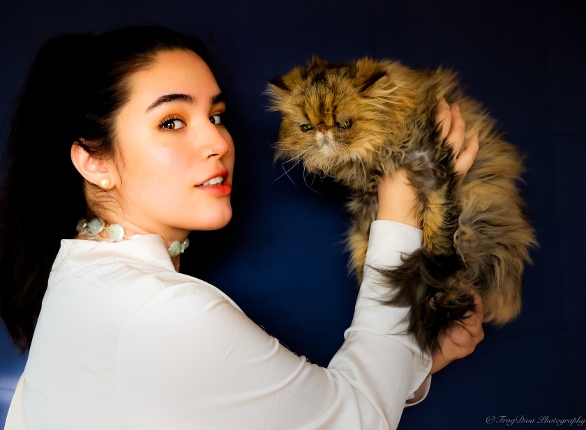 The photograph was part of a mini series we shot one afternoon in conjunction with the Girls with Pearls project, one for the first of the #lockdown and #socialdistancing projects. The inclusion of Lolita was not on the cards, as she was fast asleep when we began. She still looks half asleep in the photo even though she is wide awake and was half listening to prompts to look towards the camera. Persian cats just have that permanently grumpy look … She may be mega ditsy, but when lucid she does pose for a minute or two. So as a photographer I have a very small window to work with if Lolita is involved, otherwise the curtain of darkness comes down again, and I can’t get the light back into her eyes for several hours.