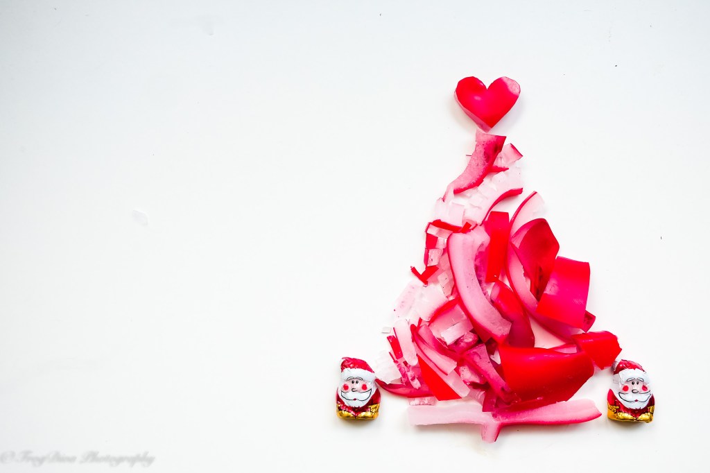 Out came the wooden board and camera, I shaped the wax chunks into a tree and placed the heart on top. No further trimmings necessary, but I did add two little chocolate Santas to create the final image below: