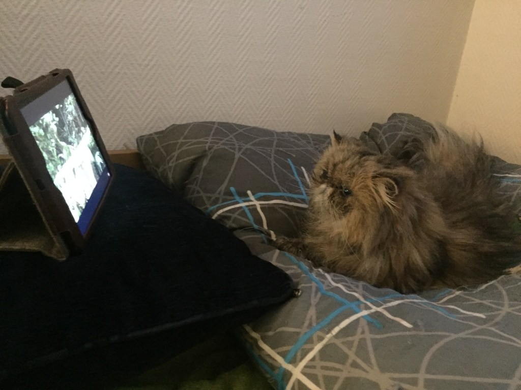 It was endearing, fascinating and highly entertaining to watch this old cat come to life in a manner that I have never seen her before. At some point she jumped down and walked around the little table, inspecting the laptop and even standing on her hind feet like a mini meerkat to investigate where the darn digital birds keep flying off to. Having failed to find the live birds, she returned to the screen and was enthralled with the continuing saga of forest birds eating birdseed. And here we humans are grumbling about nothing to watch on Netflix anymore! At some point I wanted my laptop back but madam wasn’t ready to give up her birdynovela. The next best thing was to offer her my iPad, which is a much smaller screen and if she knocked that down, there would be zero damage. She accepted that, and quickly found out that she could “kiss” the birds on the screen this way, or even try to pet them.