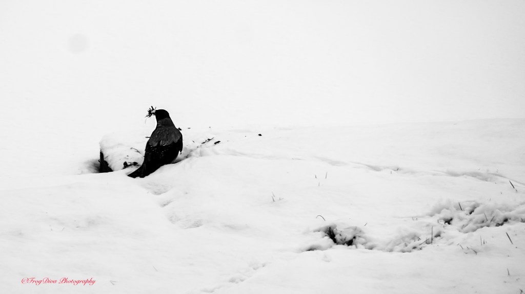 See what I mean? The snow offers the perfect backdrop and negative space that I absolutely love playing around with. Even a grumpy crow pulling up some grass becomes an eye-catcher. I would have gone one for much longer but my bare feet on the balcony told me this was not a good idea.