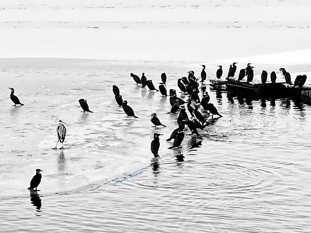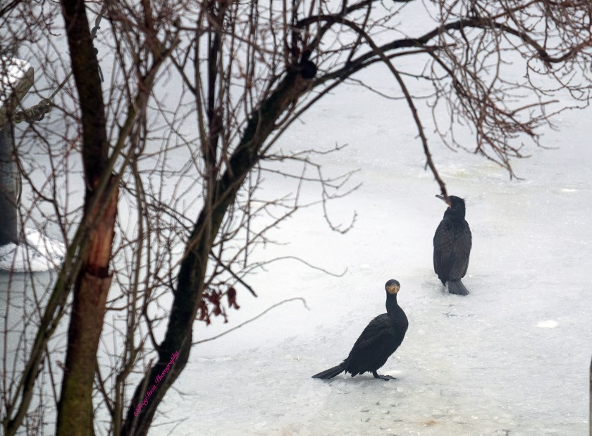 Somehow the current conditions are reflective our our lives at the moment – everything has come to a standstill, and even the animals are commiserating with us. They could have been happily floating along the river like they love to do, or chatting away in some tree, instead, the ice and snow have rendered them feathered river gargoyles.