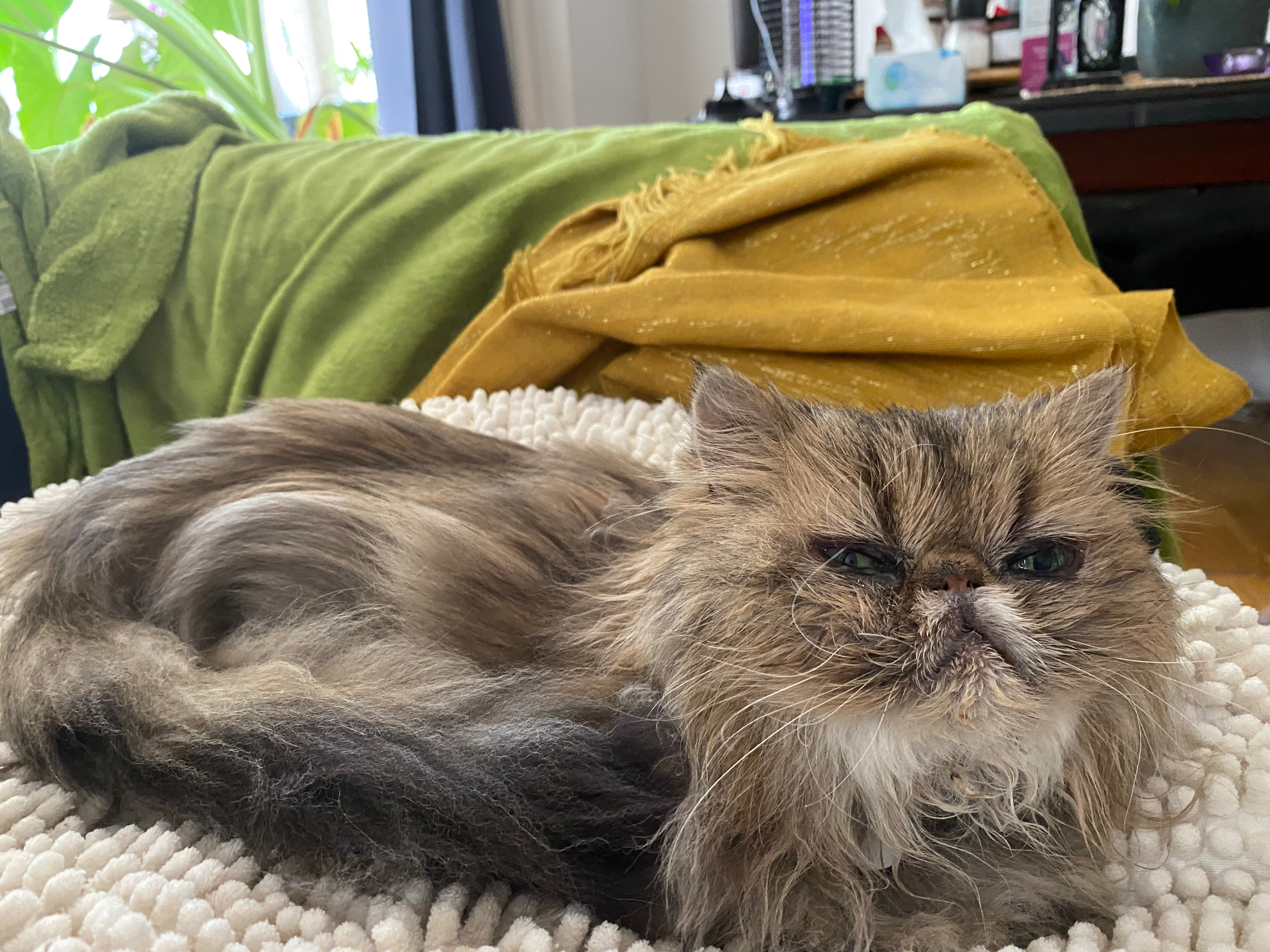 Both ladies have done very well this summer, perhaps because we had a relatively mild one this year, but they have understood the concept of an electric fan and do not resent the one-legged creature that blows air during the day. Old age is creeping up on both of them though, and neither of them can be bothered to be up at the crack of dawn for entertainment and philosophical life-altering conversations. Potty breaks are a must and so are hairball barf parties, but post-midnight chin wags are canceled, since we need our beauty snores.