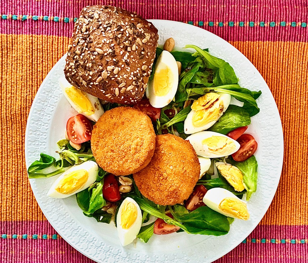 camembert medallions on a bed of lambs’s ears salad, with a fig mustard and balsamic dressing