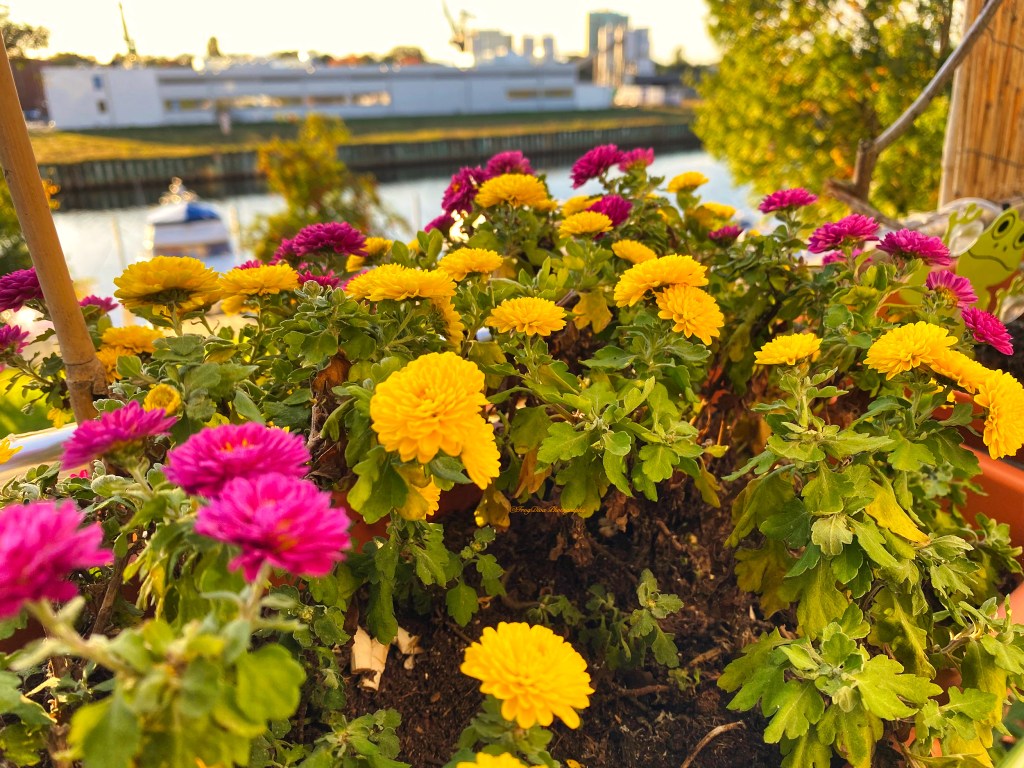 As I write this the wind is howling outside and the rain cannot make up its mind whether to stay and wreak havoc or pack its bag and leave. In other words it’s a pretty gloomy and gusty evening, unlike the gorgeous days with sunshine last week. These mini chrysanthemums have survived an entire year with me. I didn’t think they would make it through the long winter but with a lot of love and some bizarre fertilising experiments we manage to bloom again after 10 months! The experiment? Mixing coffee grounds and egg shells into the soil and then burying cigarette butts them!