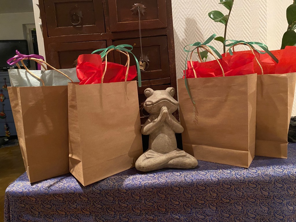 My self-imposed challenge led me to plain brown paper bags, a stash of Japanese crepe paper and some satin ribbons. Regardless if you are packing fruitcakes, books, chocolates, jams, or jewellery, the mystery of the paper bag is there, and you can always play around with the crepe paper.