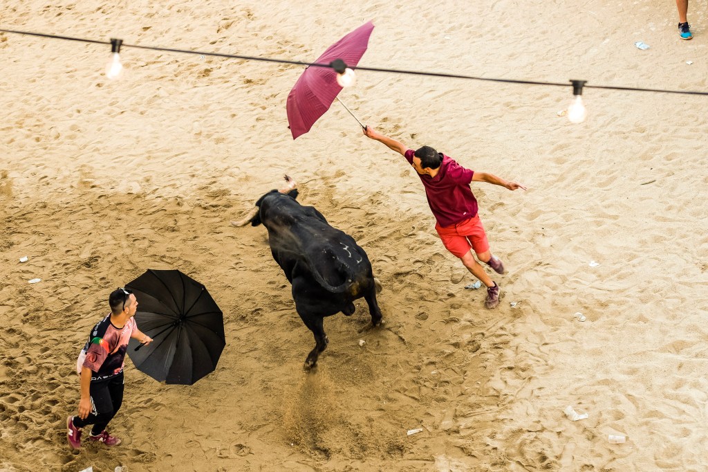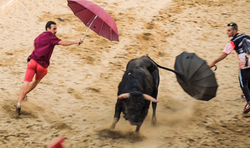 It begins with a herd of bulls and a squadron of riders with spears galloping through the streets, and then eventually make their way back to the enclosed areas where they are kept. Then individual bulls are set loose among designated street for the crowds to taunt and then run away from. If the bull is tired, confused or unwilling to be the aggressive crowd pleaser people expect him to be, then there are designated people armed with umbrellas no less, to taunt the poor animal: