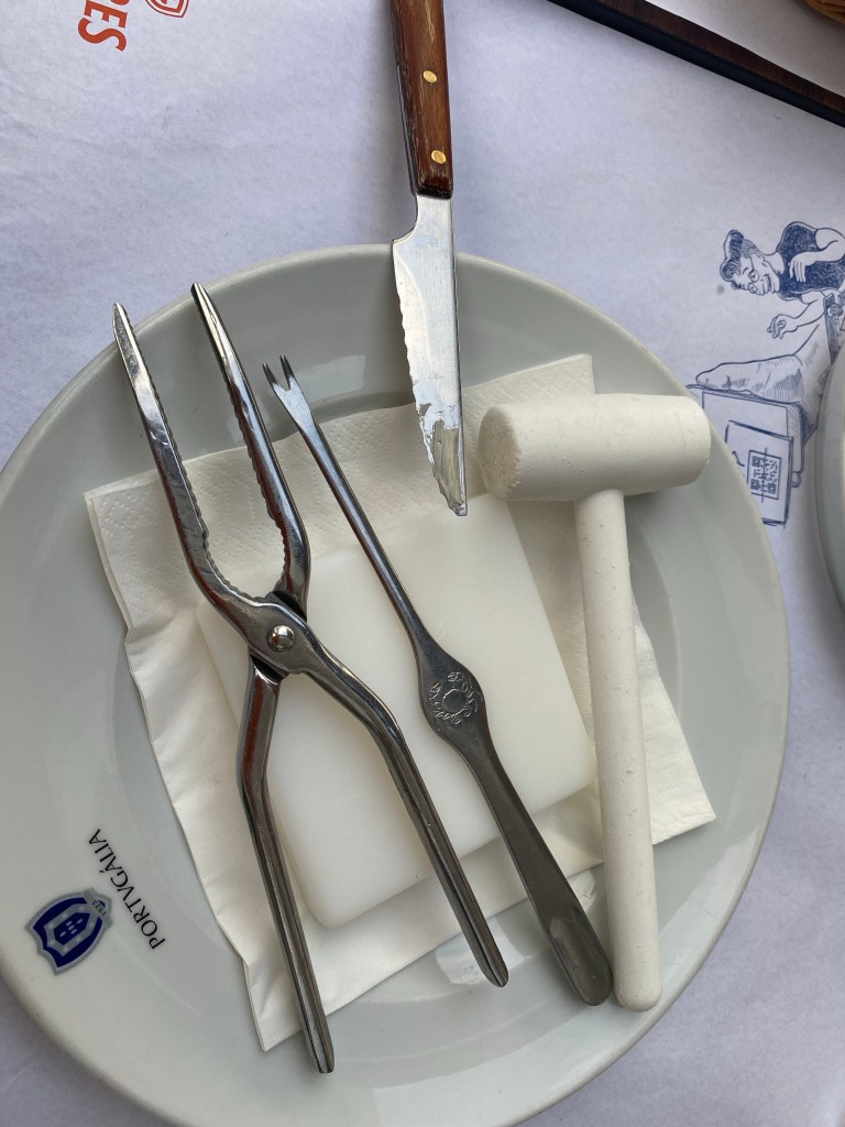 Considering that Maike was headed back to Germany, we decided this was her last chance to indulge in shrimps and crabs, so indulge we did! I honestly can’t remember the last time I ate so much seafood in such a short time. What we consumed over the five days she was here is something I have not had since Thailand, specifically the freshness and topnotch quality! This place was a bit more upmarket that the seafood dive we were at the night before in Vila Franca, the type of place where you spoke softly and could not hear the conversations from the other tables. This was a pity because we were once again equipped with crab hammers but given the ambience, didn’t dare make a racket. Instead, we used the other shell crackers. I have to be honest though, when the waiter set down the plate of instruments in front of me, it felt as though I had wandered into a scene of Frankenstein or the dental clinic from hell!