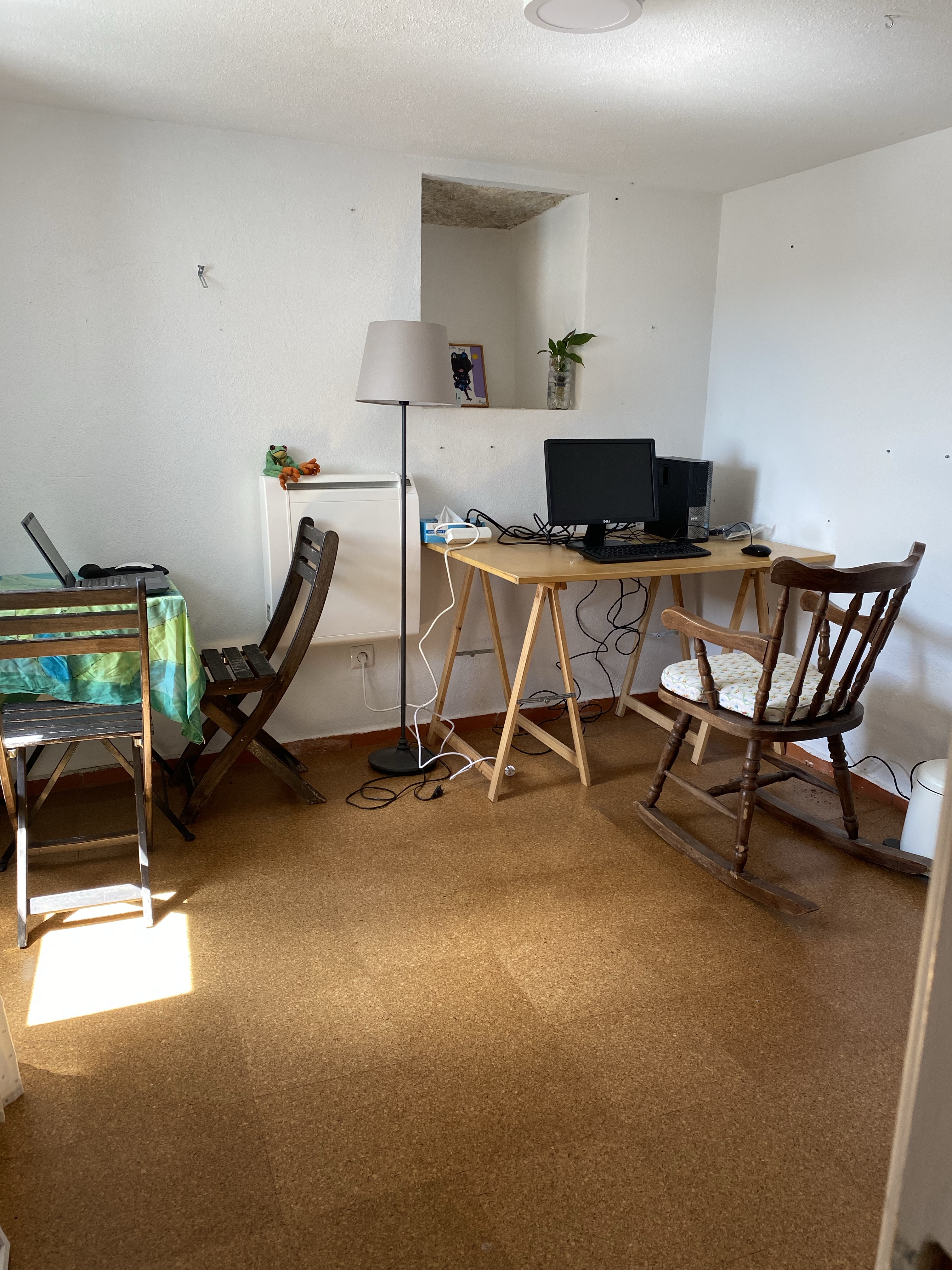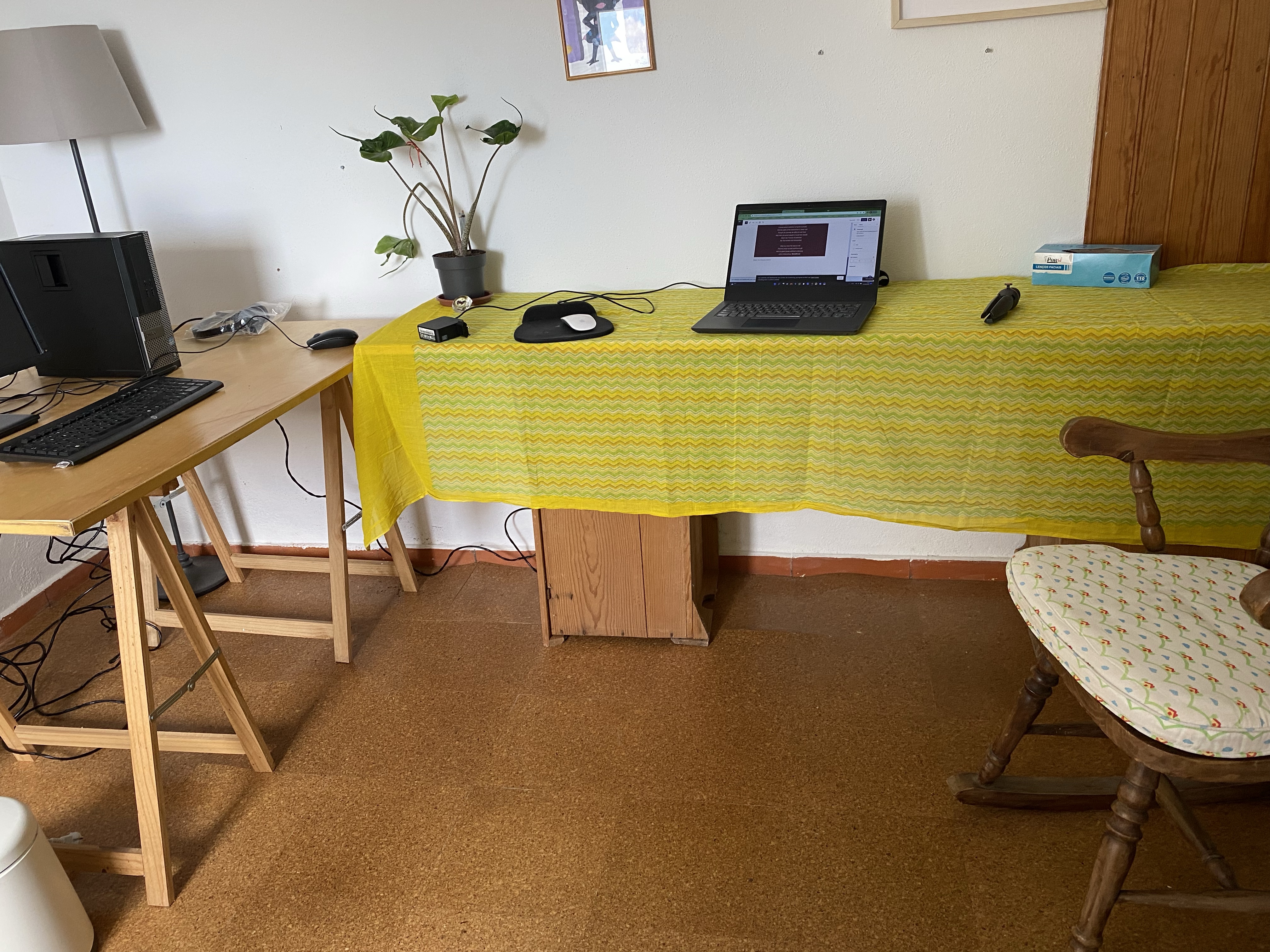 Once the nausea and migraine subsided, and my dough was left to rise, I went about continuing setting up my office. What I started yesterday felt half baked and I wasn’t sure this was the direction I wanted to take. I didn’t want to shell out for a new desk and but wanted a large working space to separate the different equipment and their respective designations. I had spotted a large workbench yesterday in the storage area, I knew it was exactly the size I wanted but it had no legs, at the original ones were already being used but the first desk. (NB: the house was fully furnished when I moved in, which is a godsend, considering that all my stuff is still in Berlin) Looking around, I realised I had two identical wooden chests that would serve the purspose brilliantly if I stood them up sideways. Long story short, I love the results, which is why I postposed blogging so late in the day.