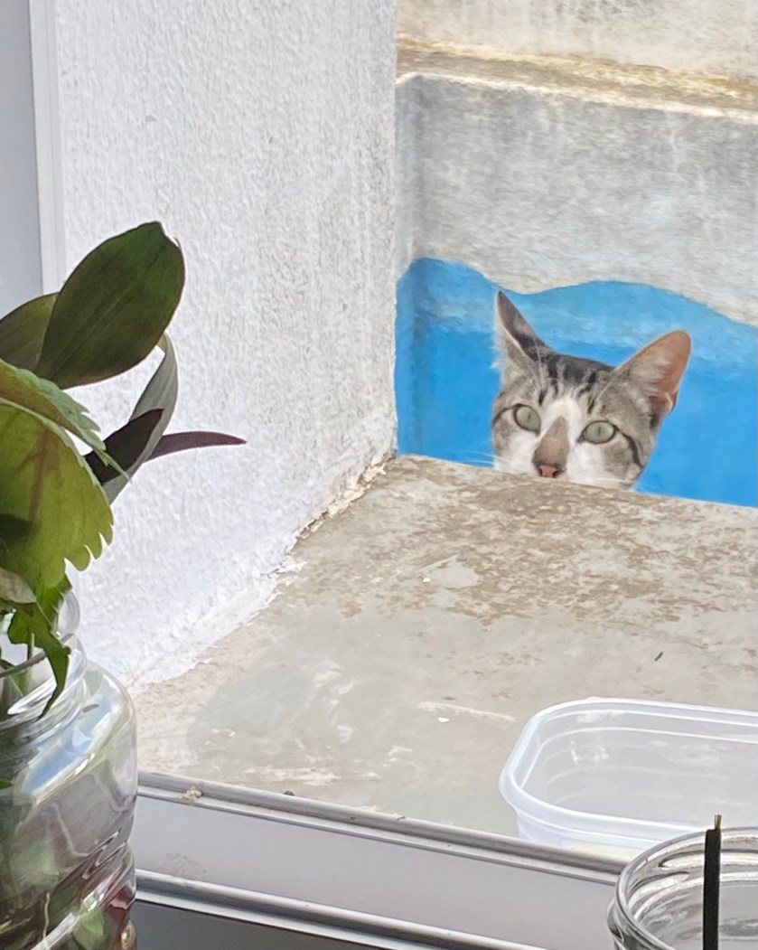 After breakfast I decided it was time to bake my first loaf of bread in the new home, the first in six months since leaving Berlin and something I have truly missed doing. Not only did was I looking forward to that delicious aroma of freshly baked bread wafting through the house, but I also wanted to test the Portuguese flours that I found yesterday and see if I could come up with an acceptable whole-wheat multigrain artisan loaf. While I gathered my ingredients at set to work at the counter facing the window, a curious little face popped in to greet me. The black cat, I was told, is named Xico, although I would have preferred to call him something more dragon-like. He was so cute and friendly that i succumed and offered him some milk. I turned my back for two minutes and when I looked at the window again there was another face, and this fellow’s name is T’challa. Again, I would have named him Simba, but I cannot interfere with something the neighbours have already established!