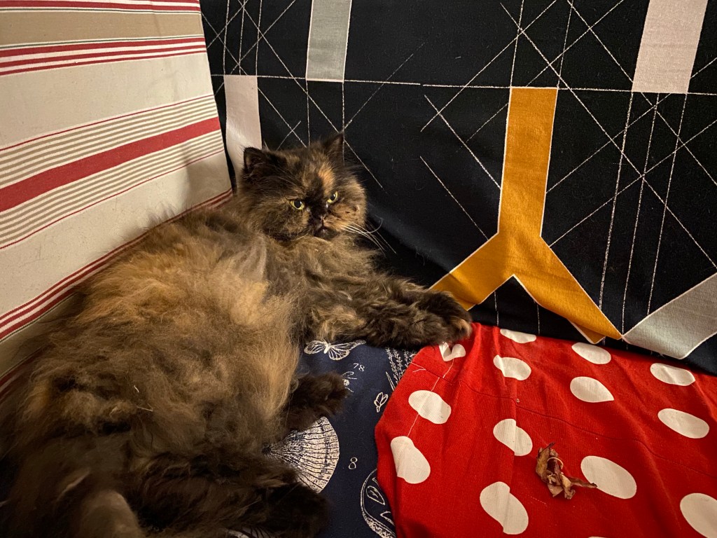 We left her alone for an hour while we ran to the grocery. By the time we returned, a somewhat annoyed looking cat greeted us at the door, as if to say “And where the f*&^ did you two disappear to?!” But food was obtained for human and feline alike. so all was well with the world and balance restored. We sat down together in the living room and the little princess took took her seat at the sofa, and let out a sigh of relief.