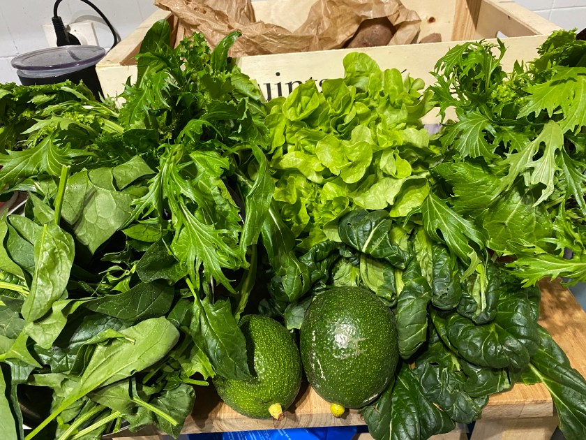 Remember I told you about the weekly fruit and vegetable delivery from the farm? As they call it on Master Chef, it’s a Mystery Box because I never know what I will receive. I know that I am sick and tired of sweet potatoes, having mashed, boiled, roasted, fried them, made rösti and gnocchi out of them as well, but they keep showing up week after week. Oh and I made sweet potato butter as well. The rest of the box varies, though there are seasonal items that become a constant for a few weeks before they disappear again, like kiwis. I have kiwis in abundance at the moment which I am definitely not complaining about! However, the farm has been churning out a lot of fresh leafy greens as of late and I can’t keep up. It’s not that I am ungrateful, on the contrary, I feel incredibly blessed for the freshness and the vitamins, but I can’t help but laugh and act like Bugs Bunny each time I open my fridge and be greeted by this: