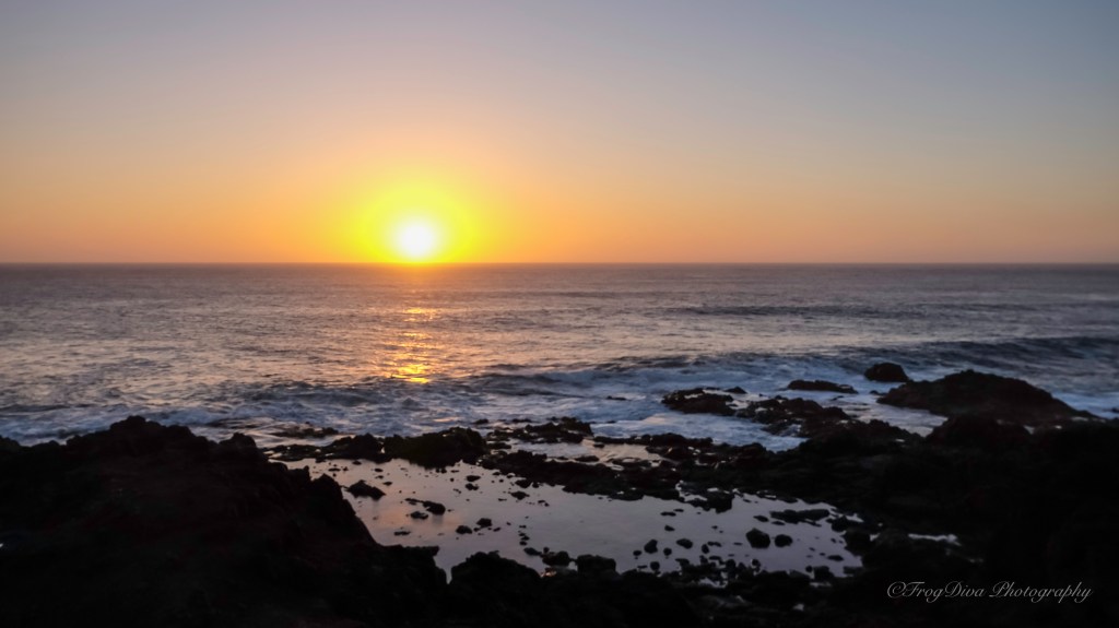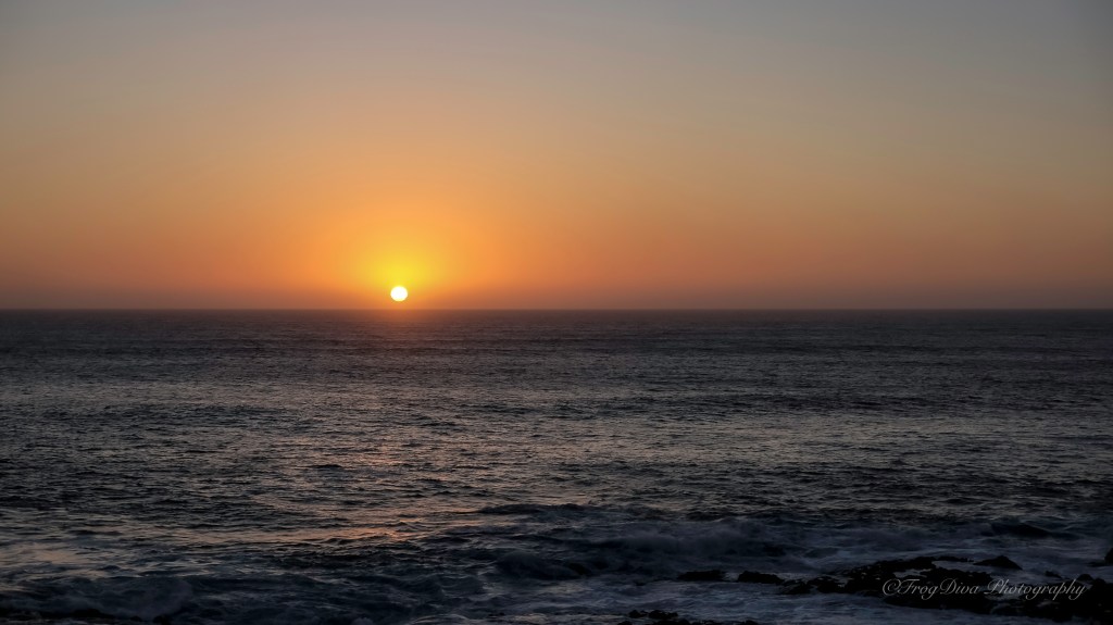 Oh what a joy to be next to the ocean again! The sound of the waves and smell of sea water is so familiar and soothing at the same time! I managed to snag the first two sunset photos this evening. I am not a huge fan of sunsets without clouds, but there wasn’t a single cloud in sight today. Apparently my arrival chased them all away. Well, I can tell you where they went – to the Shire in Portugal!