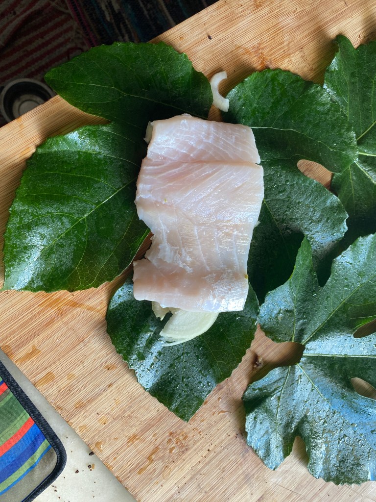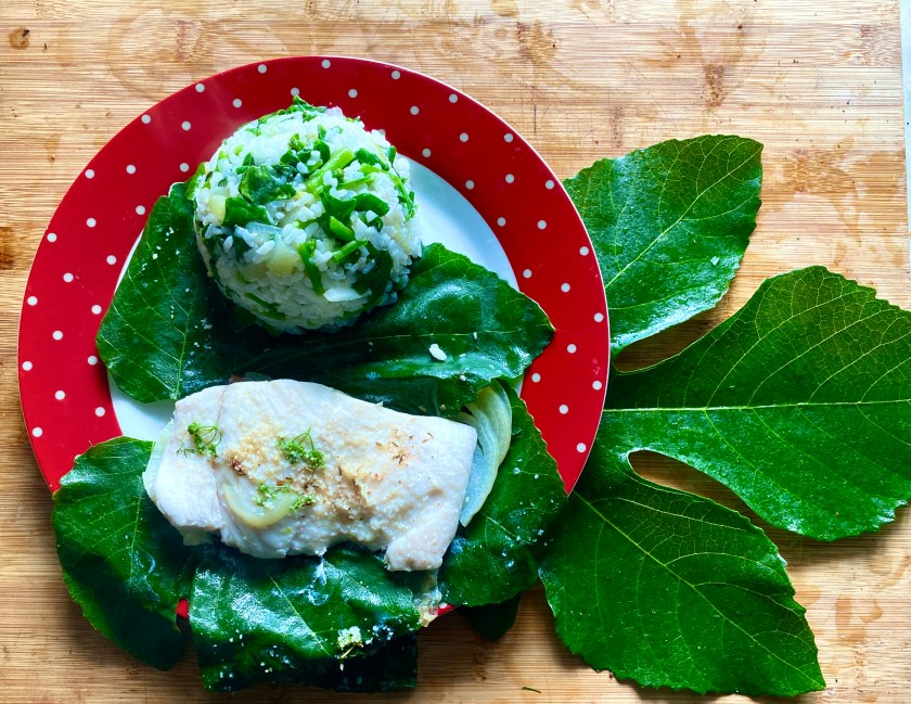 One afternoon last week I looked up at the fig leaves and wondered if they were of any use in the universe other than decorative, so I consulted Lord Google. It seemed like such a pity to have three fig trees in the garden and “only” the fruits could be consumed. Lo and behold I was flabbergasted to discover that the leaves can be cooked or used pretty much in the same way that banana leaves are in Asia or Latin America. You just have to know what you are doing and how to prepare them safely, lest you end up poisoning the food and ultimately, yourself.