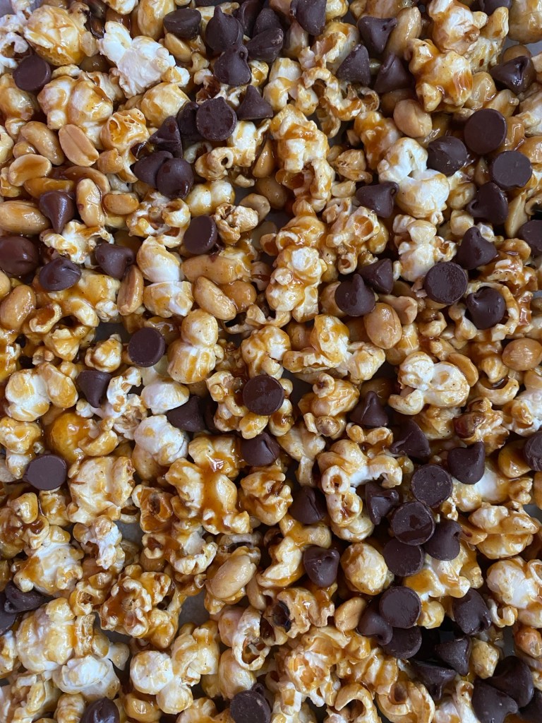 - Mix the popcorn, peanuts, cranberries and chocolate chips in a large mixing bowl and set aside.