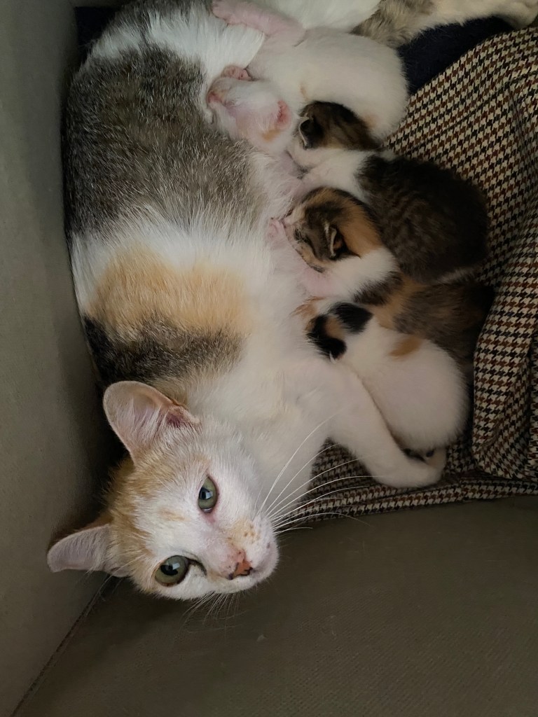 While I wallowed in self-pity, my friend Warbles grew rounder and rounder, and one evening she frantically took up residence under the sofa and gave birth to four loud kittens! They are all as chatty as their mom and just as demanding. Like Caramela, Warbles is also a first-time mom, so it took her a few days to get the hang of things. She cleaned them all up quite nicely but when she would go out for a breath of fresh air, she completely forgot all about them and would make several rounds around the house until she remembered why she came inside in the first place.
