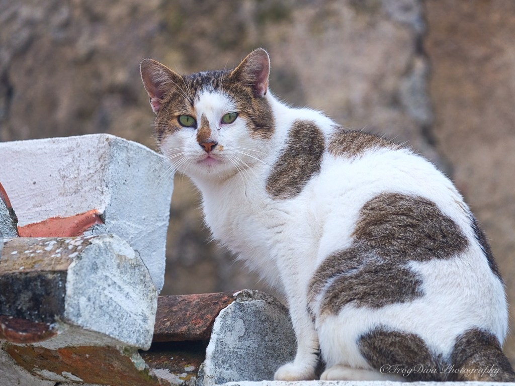 Then we have Caruso, who is even noisier than Warbles. Much as he needs a loving home, a general overhaul in manners, and fine tuning in volume control, he has spent far too much time on the streets and is very distrustful of humans in general. I just got him to trust me enough to not run away when I put food out, and he even feels comfortable enough visit the kitchen now with his son, Toffee. However, there is not much grey matter between the ears. As you can see from the photo, he has a forlorn look about him that makes me want to cuddle and snuggle him to put some spark into those lovely orbs, but I think he will be permanently friend-zoned. I named him Caruso because he sings his operas when approaching the house, when he arrives, when anyone dares to cross his boundaries, and when he leaves. He has spunk and character but is cranky and unsociable. Talents include singing, guarding and siring kittens.