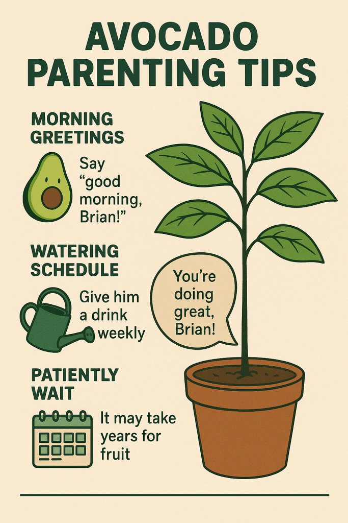 Here’s the hard truth: growing an avocado tree indoors from a seed is a bit like raising a cat and expecting it to learn how to play the violin. Technically possible? Yes. Realistically? Don’t hold your breath. Experts say it could take five to thirteen years for Brian to produce fruit, if at all. Which means he’s basically the freeloading adult child who eats all your snacks but never pays rent. Honestly? I’m fine with that. I’m not in this for the guacamole anymore, but am entirely invested in the emotional connection.